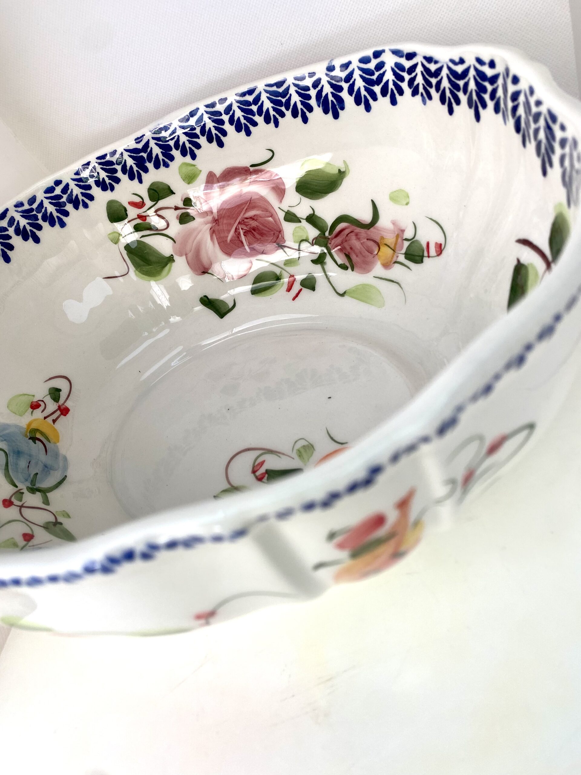 Insalatiera ovale in ceramica decorata a mano dal design delicato, di grande capacità, seduce la sua peculiarità di fondersi perfettamente con ogni tipo di arredamento.